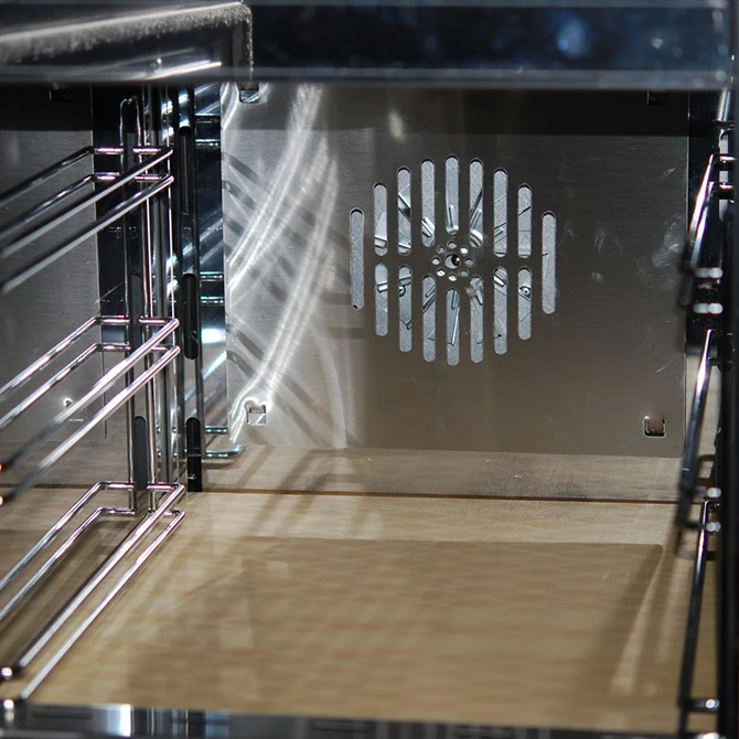 Il sistema di ventilazione uniforma il calore sui tre piani di cottura ventilando sia dal fondo che dalle pareti. Il risultato è una cottura impeccabile di tutti gli alimenti a seconda del piano di cottura.